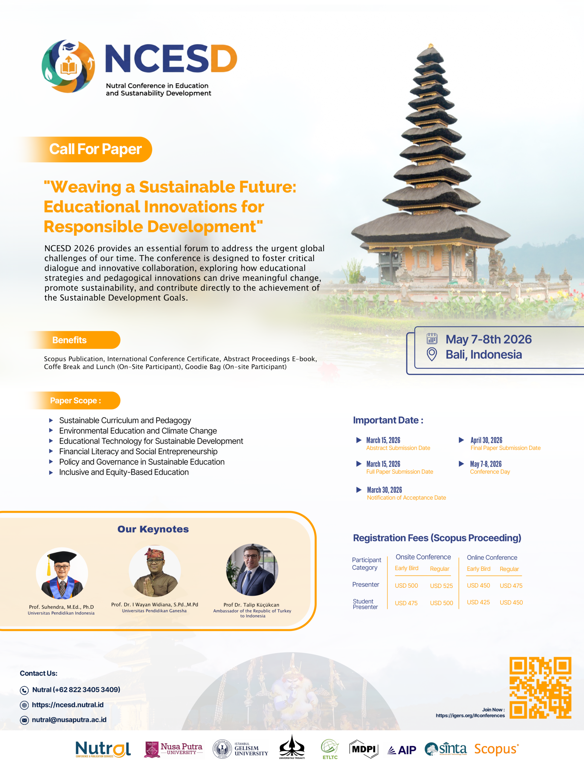 We warmly invite you to contribute actively by submitting your abstracts and full papers, presenting your research, and engaging in thought-provoking discussions. NCESD 2026 will bring together scholars, practitioners, and innovators on-site in Bali while also welcoming virtual participation, ensuring a globally connected and inclusive academic experience. All accepted papers will be submitted for publication in Scopus-indexed proceedings, subject to meeting the scope and quality requirements.